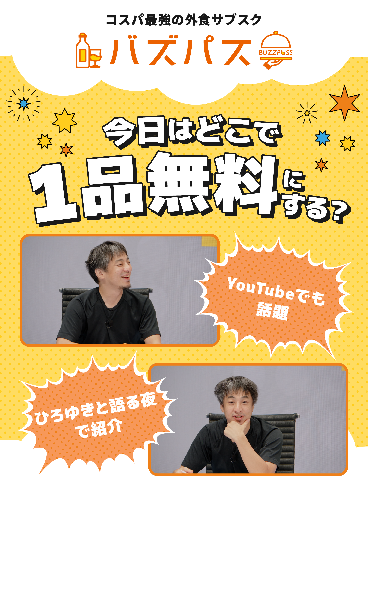 店舗ごとに設定された「特典メニュー」が1品無料になります。